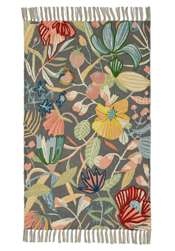 The Heather rug brings spring indoors with its delicate floral patterns printed on high-quality PET material against a sophisticated gray background. Enhanced with beautiful embroidery details, this 27x45 inch rug adds a touch of artisanal craftsmanship to your space while providing durability and easy maintenance for everyday use in any room.