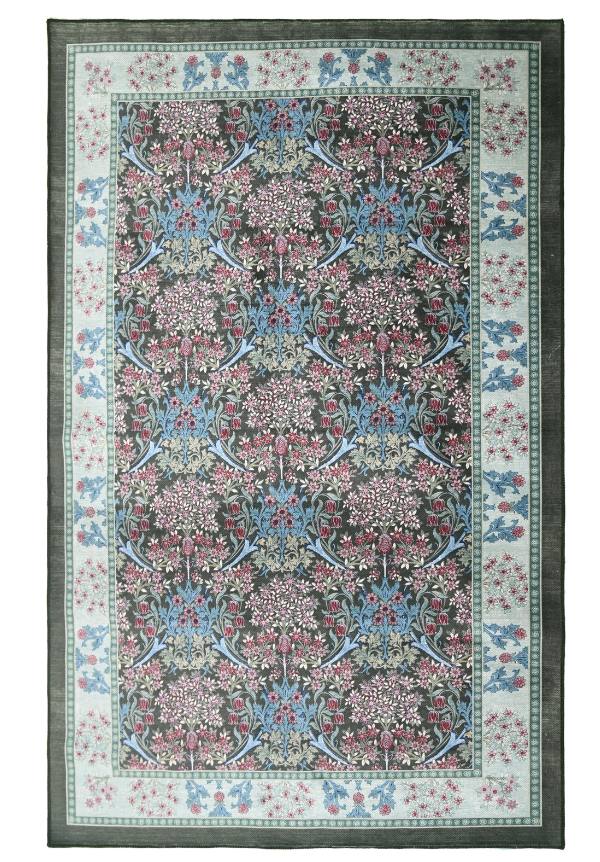 The Vine Bush scatter rug showcases a mesmerizing arrangement of dense florals in vibrant green and blue against a sophisticated wine background. This 27x45 PET rug features an elegant wide border framing beautifully dispersed motifs throughout. Durable and eye-catching, it adds a touch of artistic flair to any room while providing practical comfort underfoot.